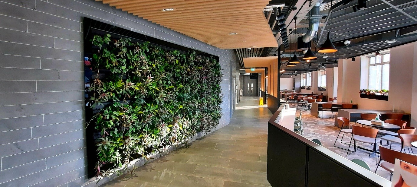 The new AIB Ann Street building refurbishment was designed with employee wellbeing in mind, aiming to create a calm, healthy and happy workplace using a combination of biophilic design elements such as moss circles on walls, planter boxes lining walkways and a state of the art ‘living wall’ which creates a welcoming atmosphere in the space.