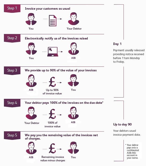 AIB (NI) will provide your business with an upfront release (prepayment) of up to 90% of the value of your outstanding customer invoices. You can stay competitive by quickly converting sales to cash, maintaining a healthy cash flow and paying your suppliers in full and on time.
