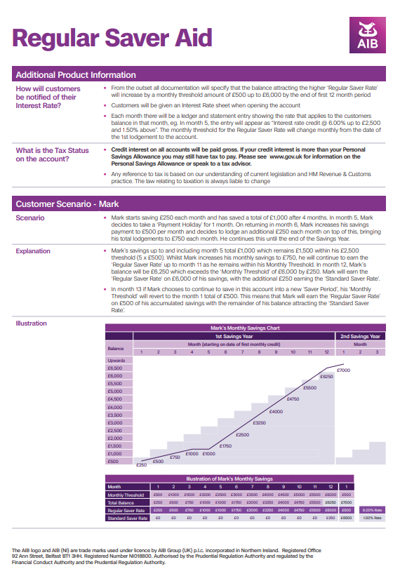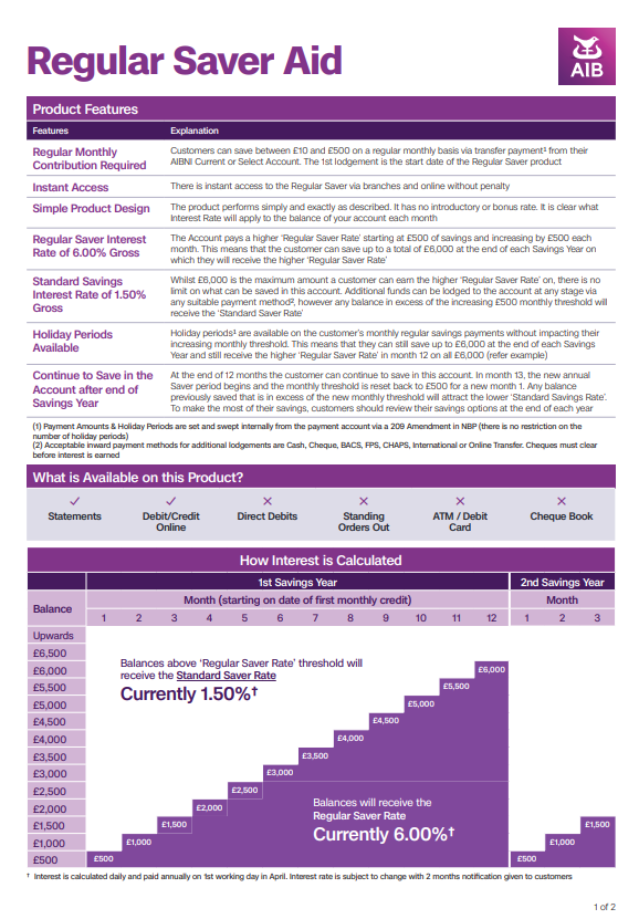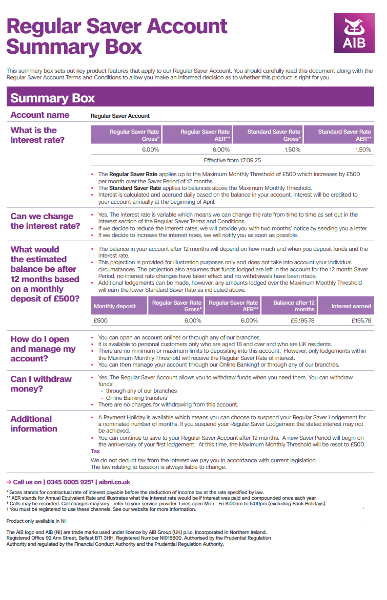 This summary box sets out key product features that apply to our Regular Saver Account. You should carefully read this document along with the Regular Saver Account Terms and Conditions to allow you make an informed decision as to whether this product is right for you.